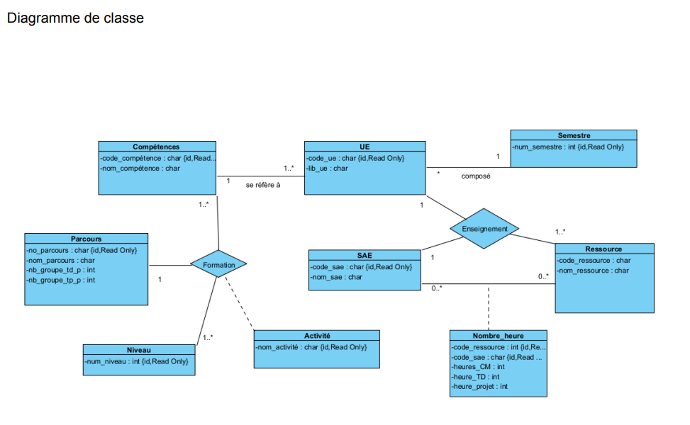 Dans le cadre de la SAE 1.04, nous avons réalisé un diagramme de classes du programme du BUT Informatique, pour réaliser ceci nous avons utilisé VisualParadigm. À la suite de ceci nous avons alors créé notre base de données en SQL (Postgresql) avec SQL Workbench.